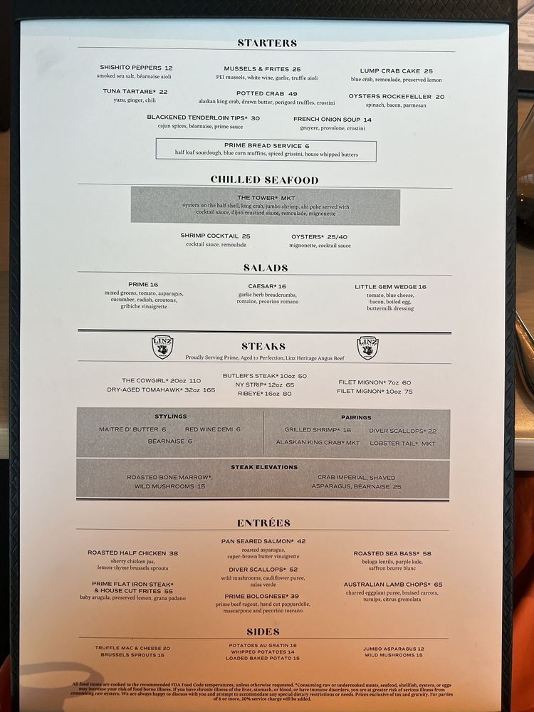 - Appetizers: Indulge in the Lump Crab Cake ($25) or Fire Roasted Prawns ($30) for a delightful start.